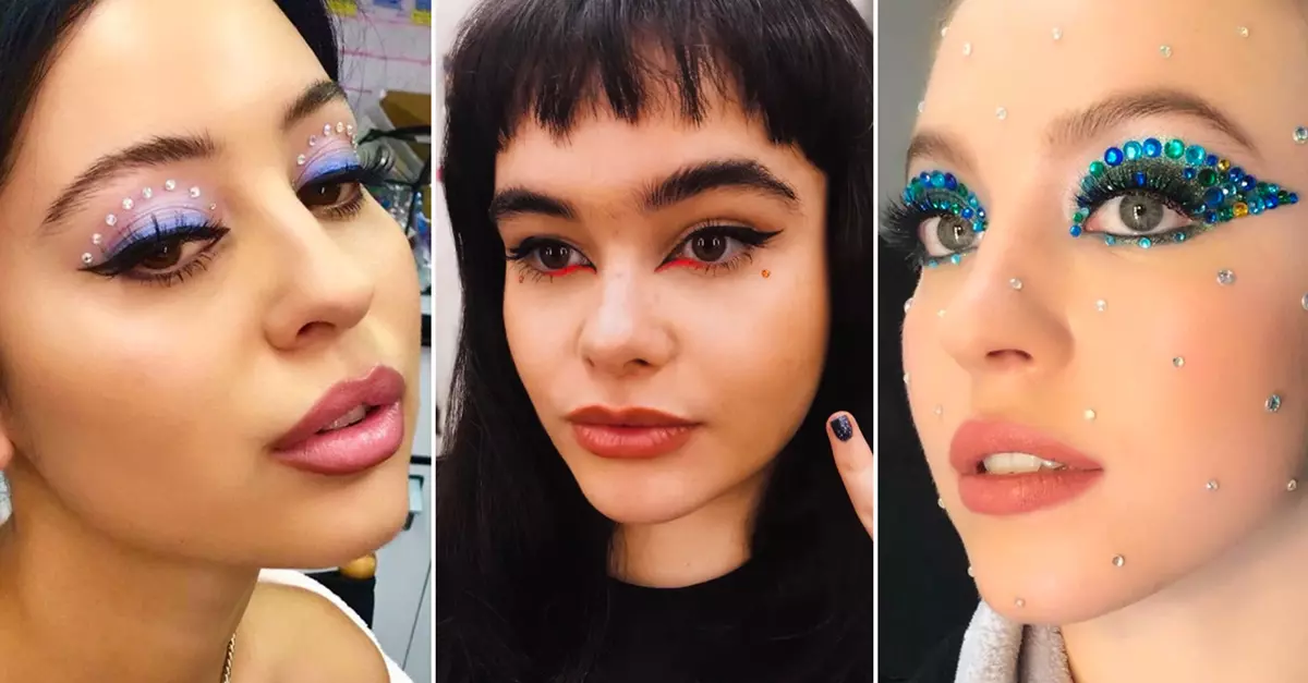 Si te sientes preparada para el desafío, recrea este look usando piedras preciosas adhesivas con una mezcla de sombra de ojos verde azulado y azul en los párpados.