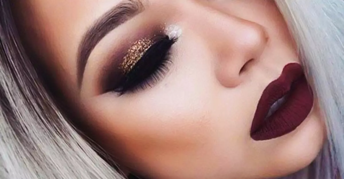 7. Combina tus labios en vino con sombras café y glitter dorado
