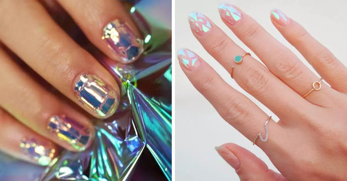 Se inspiró en el abulón, un molusco marino del que se extrae la madre perla y cuya concha reluce una hermosa superficie holográfica. Para crear este estilo ella pega pedazos geométricos de celofán en la uña. Ahora muchos salones surcoreanos están replicando la idea y creando uñas cada vez más brillantes, podrás ver algunas a continuación.