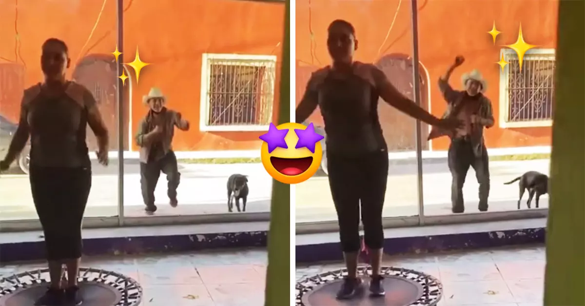 Un grupo de mujeres se encontraba en una clase que mezclaba movimientos de baile, ejercicio y el uso de un brincolín cuando un adulto mayor se paró en el vidrio de afuera del lugar y se unió a la rutina con algunos movimientos.