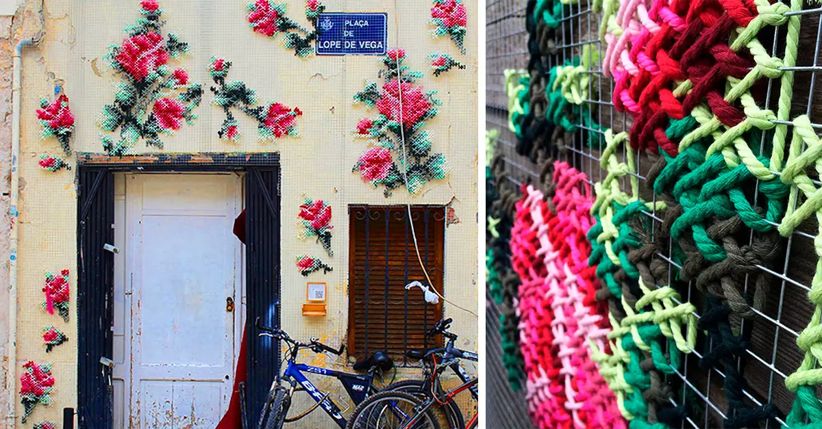 Para crear estos diseños coloridos, Raquel emplea un método tradicional de punto de cruz, con la ayuda de cuerdas gruesas de colores y una malla de alambre, dando origen a la ArquiCostura, una ingeniosa combinación de arquitectura y tejido que le permite jugar con cualquier espacio mientras crea una nueva visión de arte urbano.
