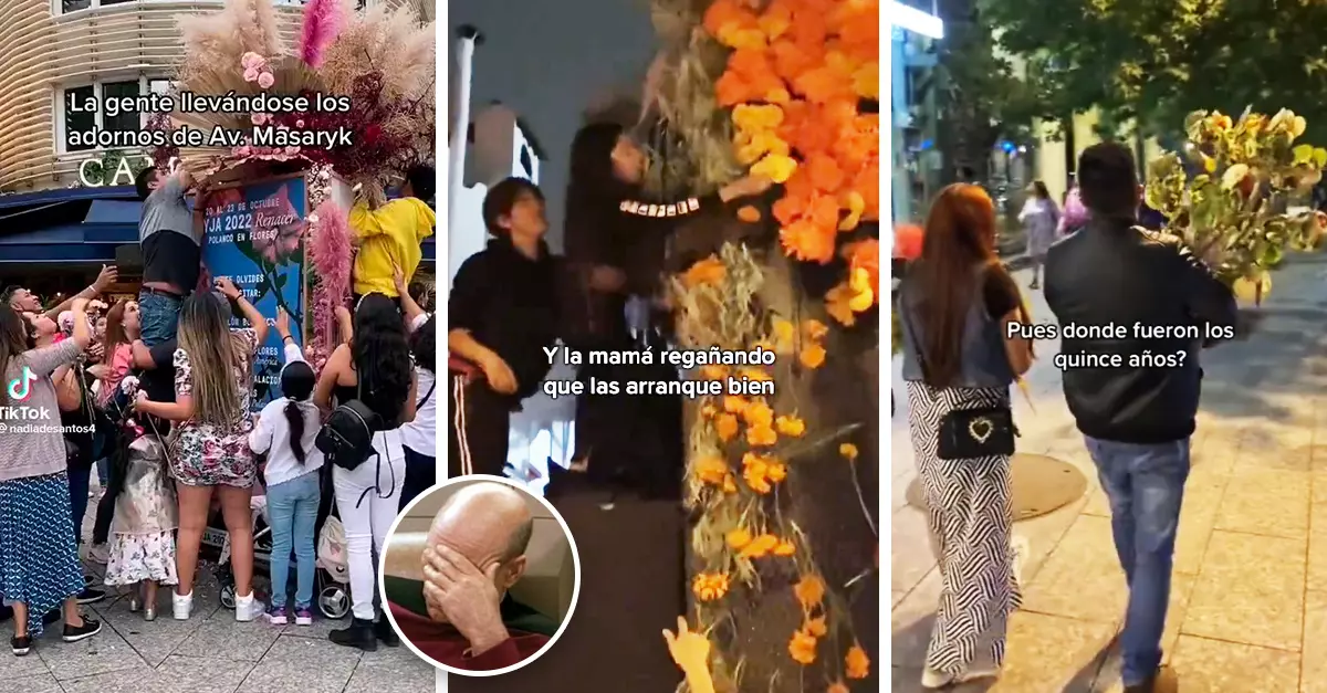 Otro de los videos en cuestión fue grabado sobre la Avenida Masaryk, donde se ve a una multitud de personas colgadas arrancando y escogiendo las mejores flores de los letreros, mientras que sus familiares les indican cuáles cortar. Casi al finalizar el video, se puede ver a la gente cargar con sus ramos camino a casa y otras personas intentando tomarse fotos con los pocos adornos que quedan.
