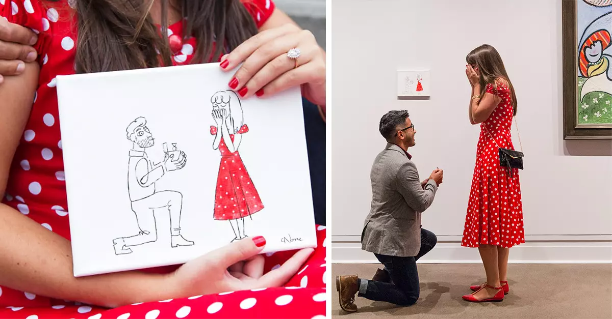 La pareja recorrió el museo y cuando llegaron a la sala de Picasso, la favorita de Marybeth, entre todas las pinturas, había una pieza que no pertenecía a la del artista. Entre las obras de arte se encontraba un pequeño cuadro que Chris había dibujado, en el cual se mostraba la escena de una propuesta, que él se encargó de recrear.