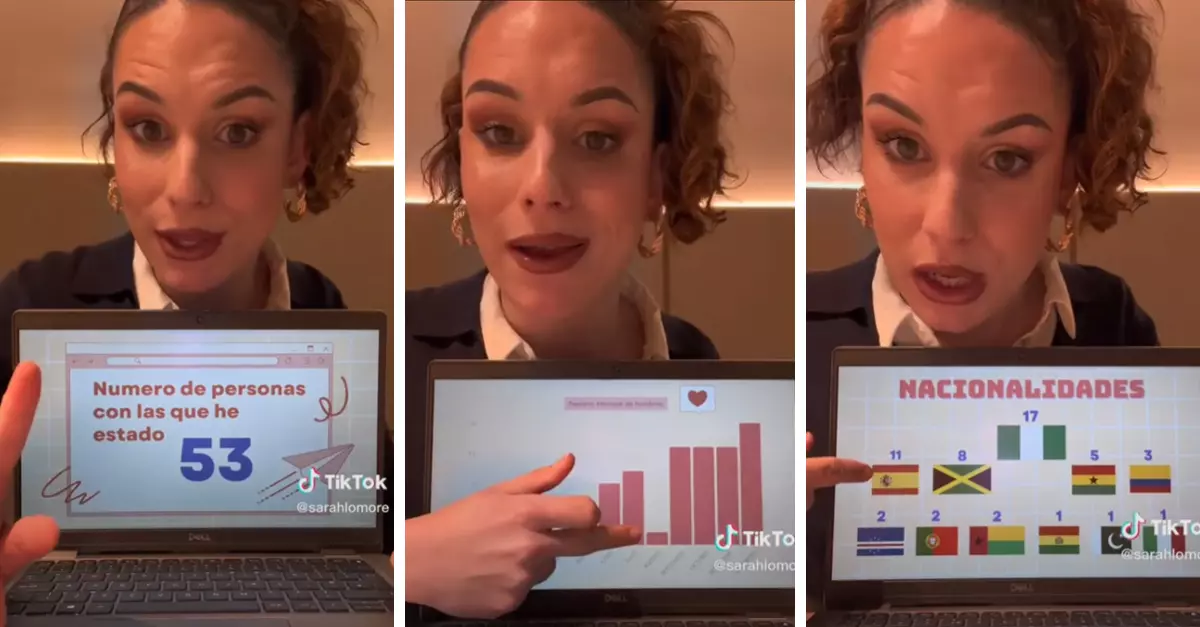 Como el caso de una tiktoker identificada como Sarah Lómore, que recientemente se viralizó en redes al exponer su mala fortuna en las cosas del amor. A través de unos gráficos con la nacionalidad de sus citas y toda la cosa, la chica explicó el recuento y las conclusiones a las que llegó tras salir con 53 hombres a lo largo del 2022.