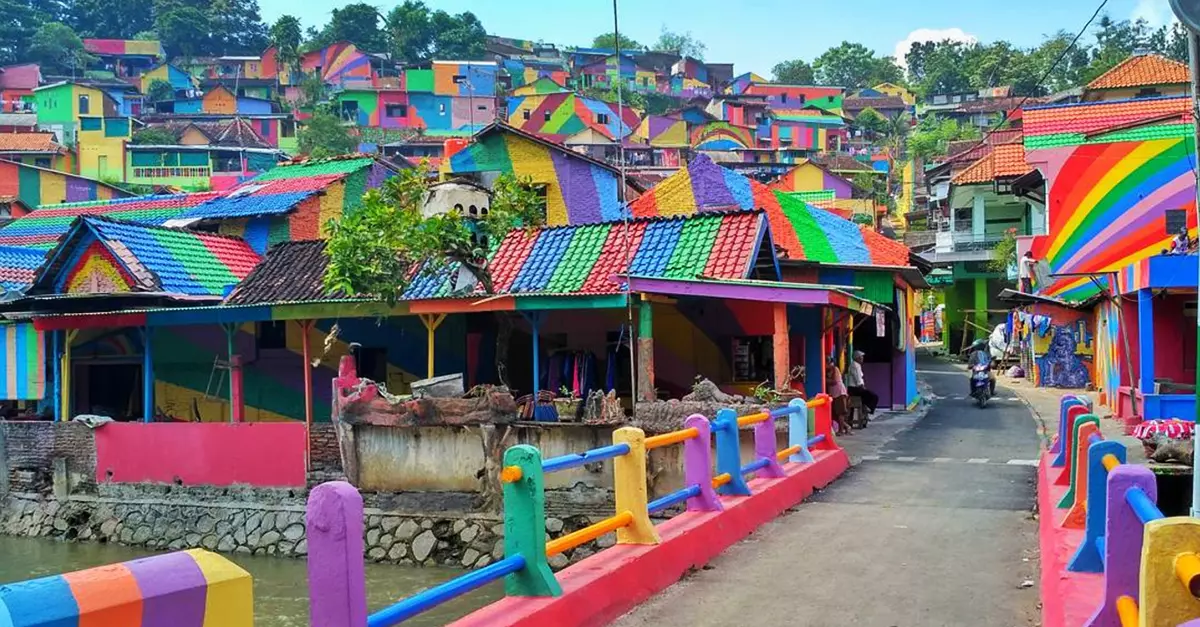 Kampung Pelangi es un pequeño pueblo ubicado en Randusari, Indonesia, que ha decidido detonar el turismo en la zona. El gobierno local invirtió 23 mil dólares en la campaña de posicionamiento que cambió el nombre del otrora pueblo grisaceo de Kampung Wonosari al de “Aldea del Arcoiris” (Kampung Pelangi) y adornó con colores cada espacio de la ciudad.
