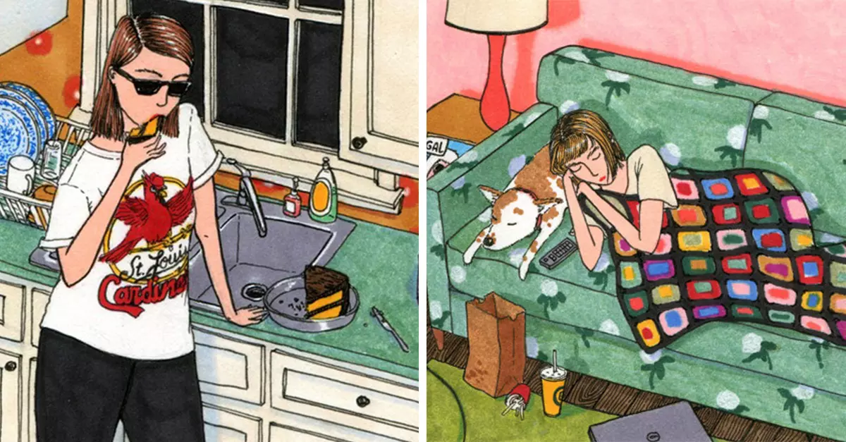 Las ilustraciones de la artista Sally Nixon exponen los momentos de la vida privada de las mujeres que no siempre son captados por la cámara, para ser publicados en las redes sociales. A través de imágenes con actividades cotidianas, Sally nos recuerda que las mujeres también son personas con una vida espontánea.