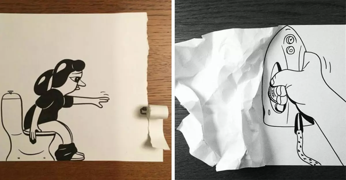 Es el caso del artista danés HuskMitNavn, quién crea mundos en segunda y tercera dimensión al doblar y “maltratar” el papel en el que dibuja, generando la sensación de que los personajes saltan fuera de la página.
