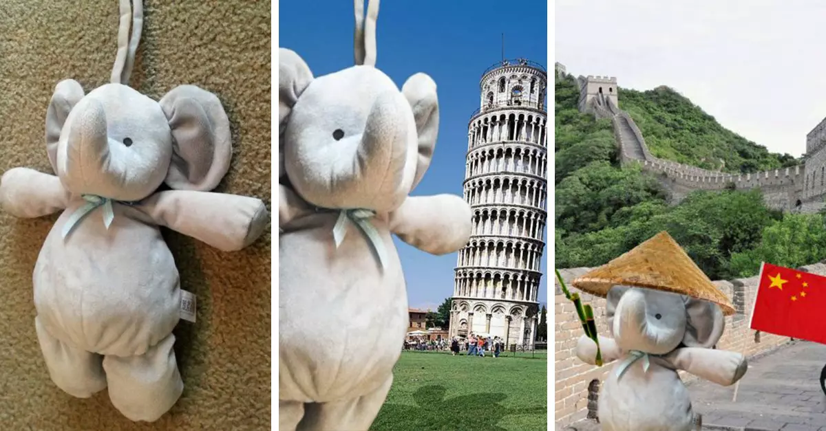 Su hijo había perdido su peluche favorito así que ellos le dijeron que no estaba extraviado, sino que estaba de viaje al rededor del mundo. La historia se difundió en Reddit por el usuario Kontankarite quién publicó una foto del peluche junto al siguiente mensaje: