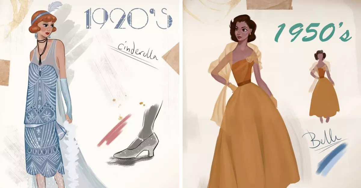 Esta vez el ilustrador israelí Amit Naftali reinventó a estos personajes de cuento de hadas vestidas con hermosas prendas de época, desde 1910 hasta los 2000. ¡Es un verdadero viaje en el tiempo!