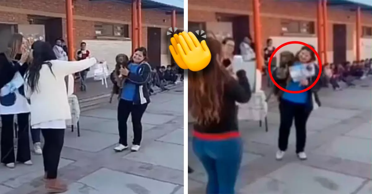 En la conmemoración del Día de la Bandera, una de las docentes utilizó el espacio para pedirle a los asistentes que le dieran un fuerte aplauso y reconocimiento a Chori cuando le entregaron un diploma por su buen comportamiento, pues además de respetar y no morder a los peques, también los cuida.