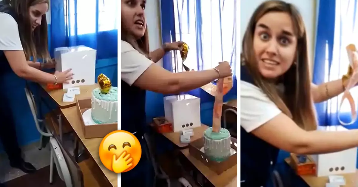 Mientras la profesora admiraba una caja color blanco que contenía la tarta con su nombre, todos los estudiantes le gritaban que abriera la caja. Con ayuda de una madre de familia, la mujer destapó el pastel, que en el centro contenía un globo de corazón, mismo que debía estirar para descubrir su sorpresa.