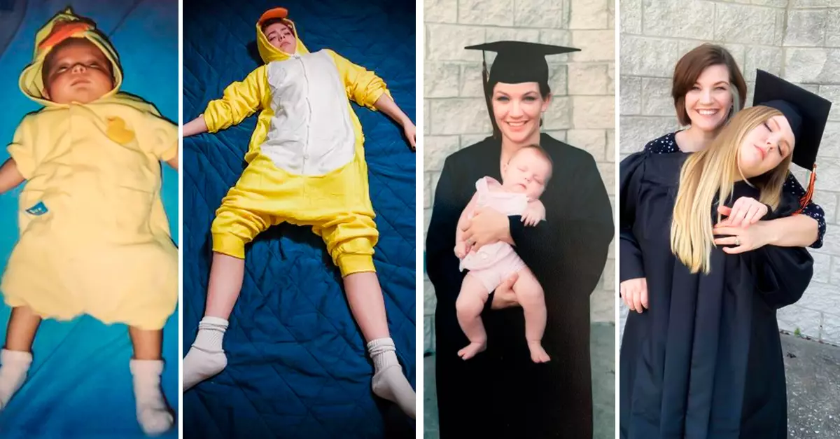 Yo cargando a mi pequeña hija en mi graduación de la secundaria en 2002; yo cargándola aún más fuerte en la suya en 2020.
