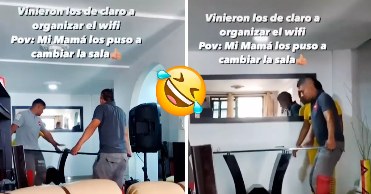 Toda ama de casa trata de que las cosas estén en orden y busca la manera en que sus muebles luzcan de la mejor manera posible. Eso es algo que tiene muy claro esta madre colombiana, quien aprovechó que los técnicos del servicio de Internet fueron a revisar el Wifi para luego ponerlos a reacomodar la sala y el comedor de su vivienda.
