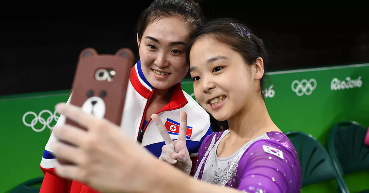Lee Eun-Ju es una gimnasta de tan sólo 17 años que está representando a Corea del Sur en la Olimpiadas de Río 2016; su competidora es Hong Un Jong y representa a Corea del Norte. Jong ya es toda una campeona olímpica, pues en el 2008 ganó el oro en Beijing, en la competencia de salto femenil. Ambas chicas fueron captadas en una plática muy divertida mientras se preparaban para competir por la calificación en la rama de gimnasia artística femenil. Afortunadamente varios fotógrafos pudieron capturar el momento cuando Lee Eun-Ju tomó su celular y con la otra mano hizo el símbolo de paz mientras se tomaba una selfie con su contrincante.