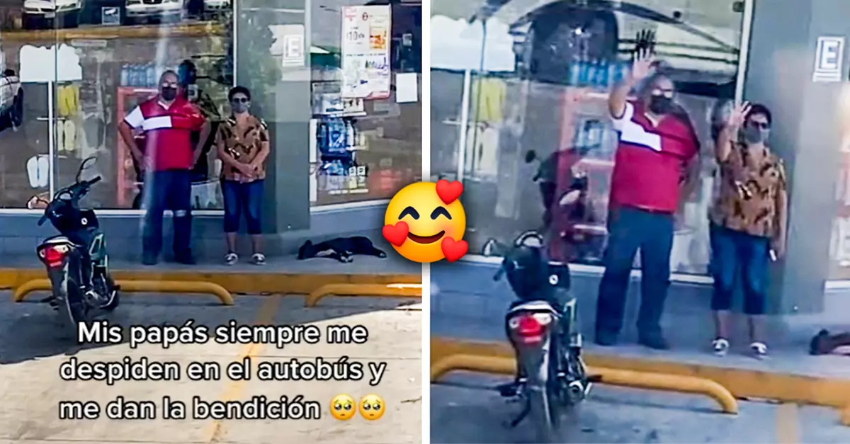 Tal parece que dicha acción es realizada todos los días por sus padres, quienes se paran frente a una tienda comercial de la cadena OXXO y la despiden haciendo un tierno gesto con la mano.
