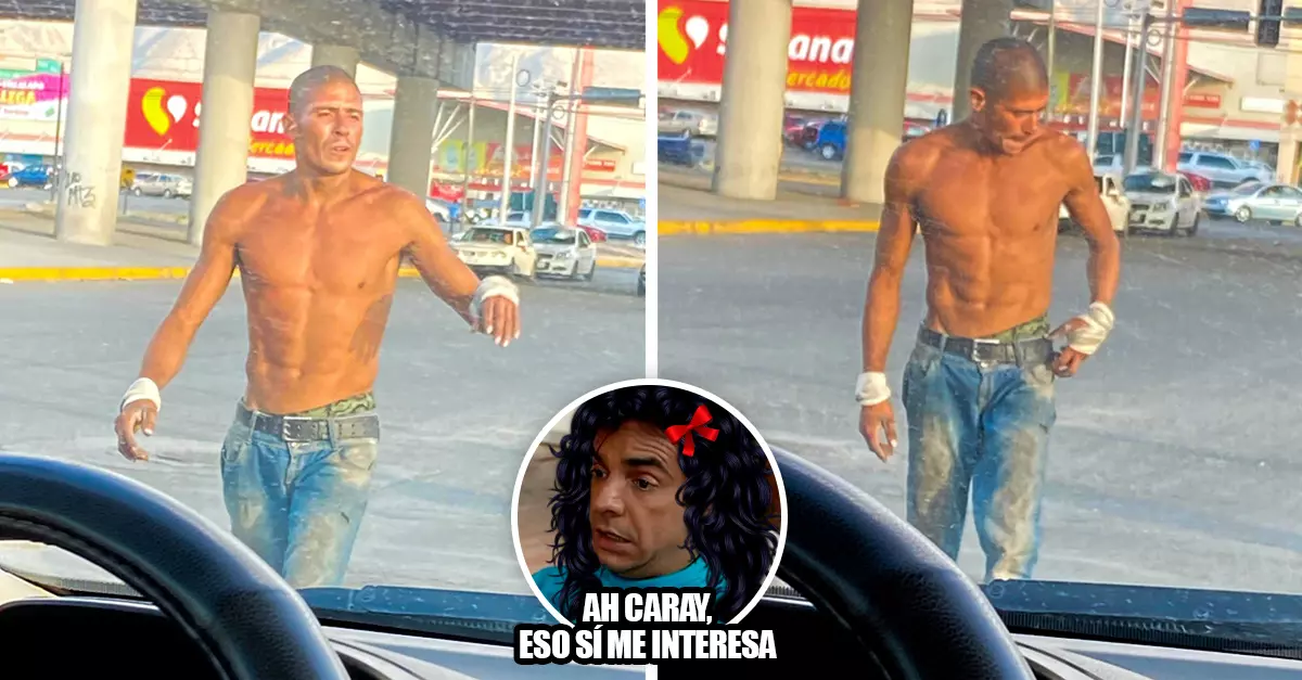 Al verlo en jeans y sin camisa, la mujer no dudó ni tantito en tomarle un par de fotos y subirlas a su cuenta de Facebook, en donde acompañó la publicación con un texto explicando que el individuo tiene músculos más trabajados limpiando parabrisas y haciendo malabares en los cruces durante el semáforo en rojo que muchos que usan suplementos y van al gimnasio.