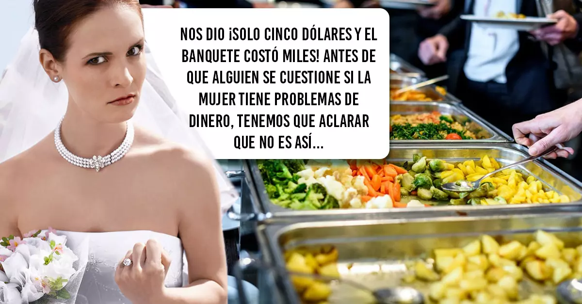 Nos dio solo cinco dólares, ¡solo cinco dólares y el banquete costó miles! Antes de que alguien se cuestione si la mujer tiene problemas de dinero o algo parecido, tenemos que aclarar que no es así. Probablemente esté mejor que yo, y supongo que todo lo hace porque no le gusta pagar por nada, es posible que en todas las fiestas haga lo mismo.