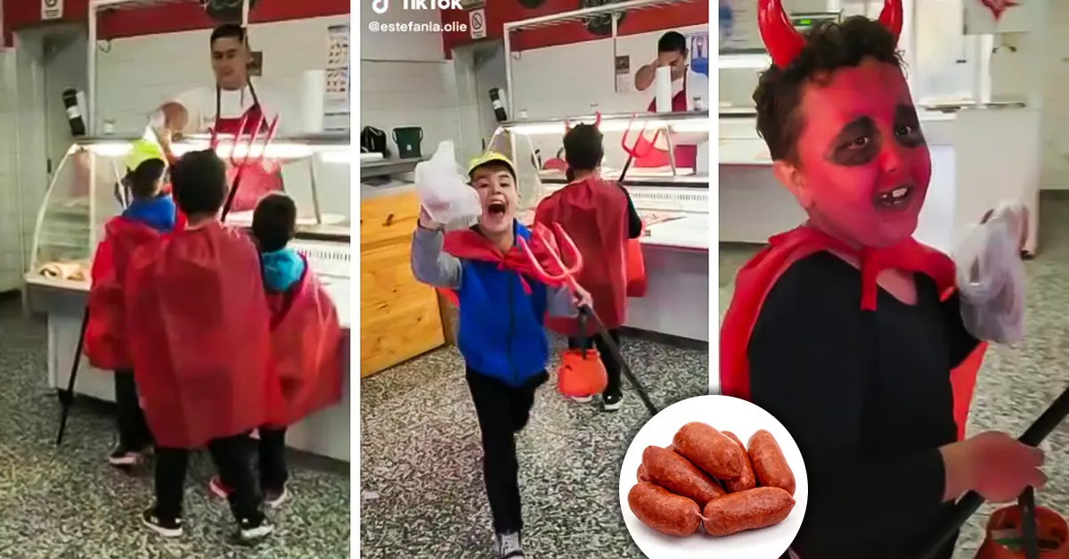 Disfrazados con una capa, cuernos, un trinche y la cara pintada de color rojo, los menores que iban caracterizados de diablos sorprendieron a todos en redes por recibir felices el chorizo que el carnicero les ofreció en lugar de golosinas, ya que aseguran que lo usarán para hacer choripan, un platillo típico argentino.
