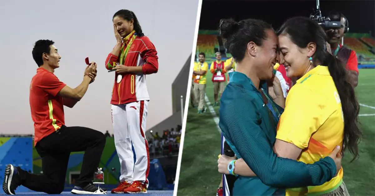 La primer pareja en comprometerse fue la jugadora brasileña de Rugby Isadora Cerullo y su novia, la voluntaria Marjorie Enya; y hace sólo un par de días los clavadistas He Zi y Qin Kai decidieron comprometerse justo en el momento en que ella recibía su medalla de plata.