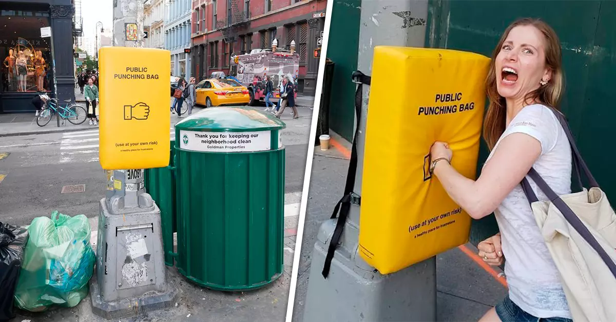 El Dttww, por sus siglas en inglés, instaló sacos de boxeo en postes de la ciudad de Nueva York para que las personas los golpeen y así eliminen sus frustraciones sin tener que lastimar a otros con palabras o físicamente.