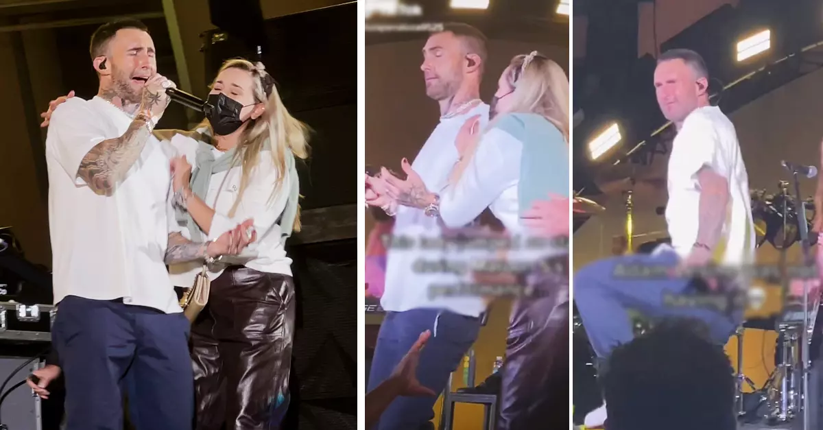 Mientras Levine estaba en el escenario interpretando su éxito Sunday Morning, a una de sus fans le pareció una muy buena idea subir para abrazarlo y tener un poco de su atención. Por su parte, el cantante estaba muy concentrado en su actuación cuando repentinamente sintió que era jalado del brazo y de inmediato volteó su mirada hacia la chica.