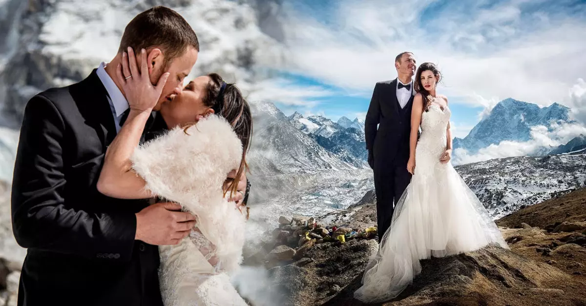 A 8 mil 848 metros de altura, con un único invitado, el fotógrafo especialista en bodas extremas Charleton Churchill, y acompañados por un equipo de sherpas (nativos de un pueblo cercano a Nepal), cambiaron las mesas elegantes y las velas por tiendas de campaña, piolets y mochilas.