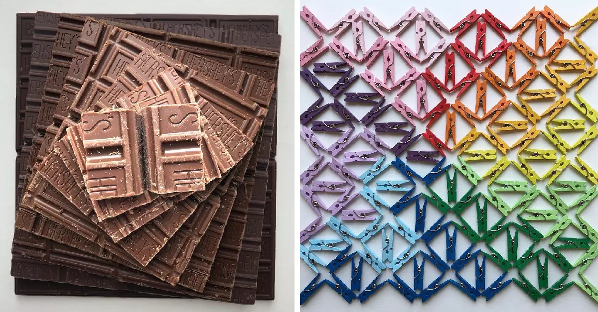 El artista visual Adam Hillman crea coloridos y perfectos patrones usando todo lo que encuentra a su paso, desde cubos lego, crayolas y huevos, hasta caramelos y manzanas. Cada una de sus creaciones le toma aproximadamente dos horas, esto sin incluir el tiempo que tarda en encontrar cada una de las piezas necesarias.