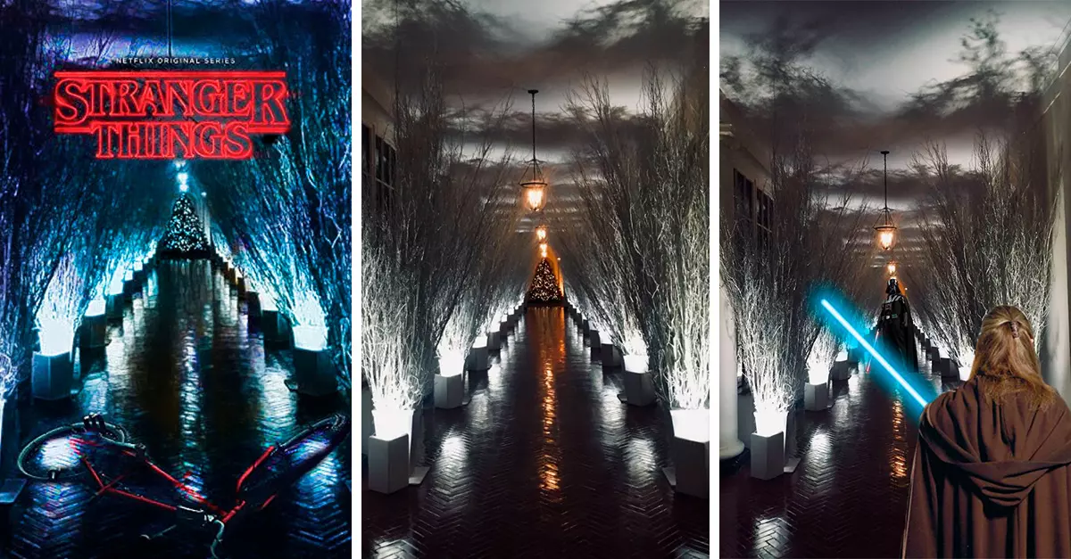 Lo que no esperaba la señora Trump fue que una de las fotos de un pasillo ornamentado con arboles blancos fuera objeto de risas gracias a los troles de Internet. La batalla de Photoshop no tardó en iniciar y los usuarios de Twitter pusieron personajes de The Shining, de Stranger Things y hasta el mismísimo Jack Skellington. Checa las mejores a continuación.