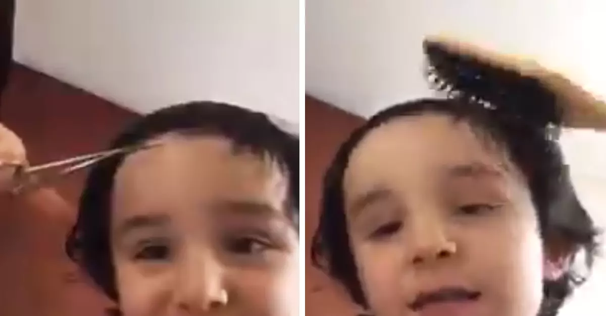 En el video, que fue compartido en Twitter, se puede ver que un niño de aproximadamente 8 años de edad se está cortando el cabello, especialmente en la parte del frente.
