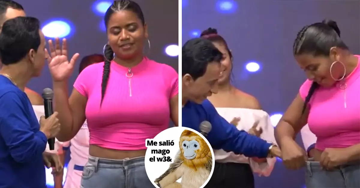 Antes de que alguien pudiera tacharlo de mentiroso, Esteban comprueba ante la mirada estupefacta del público que, efectivamente, la chica ha adelgazado. ¿Cómo lo hace? pues claro que jalando el pantalón más elástico de este mundo. Pero, por si quedaban dudas, la chica confiesa que el jean ya no le queda tan apretado como antes. Y así nomás, método científico pa’ qué lo queremos.