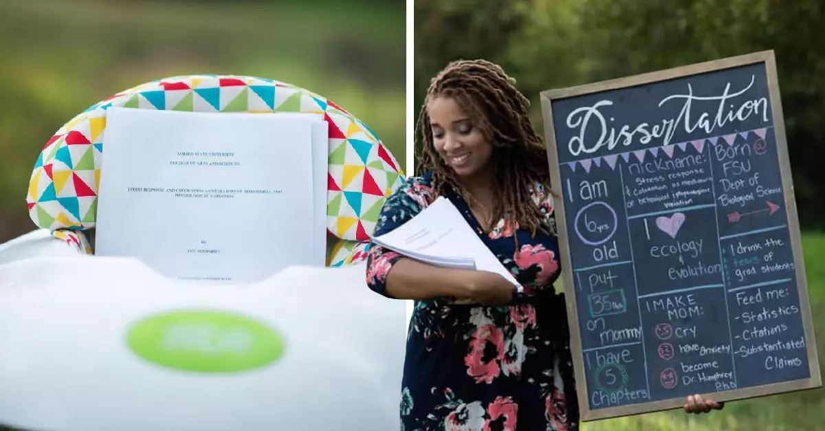 Eve concluyó sus estudios con excelencia, lo que le abre una nueva oportunidad para ser docente a nivel universitario, su sueño más anhelado. Por ello la mejor manera de celebrar su esfuerzo y éxito fue con una sesión de fotos estilo “recién nacido”, en la que su tesis fue el bebé al que dio vida.
