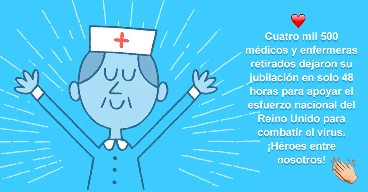 Cuatro mil 500 médicos y enfermeras retirados dejaron su jubilación en solo 48 horas para apoyar el esfuerzo nacional del Reino Unido para combatir el virus. ¡Héroes entre nosotros!