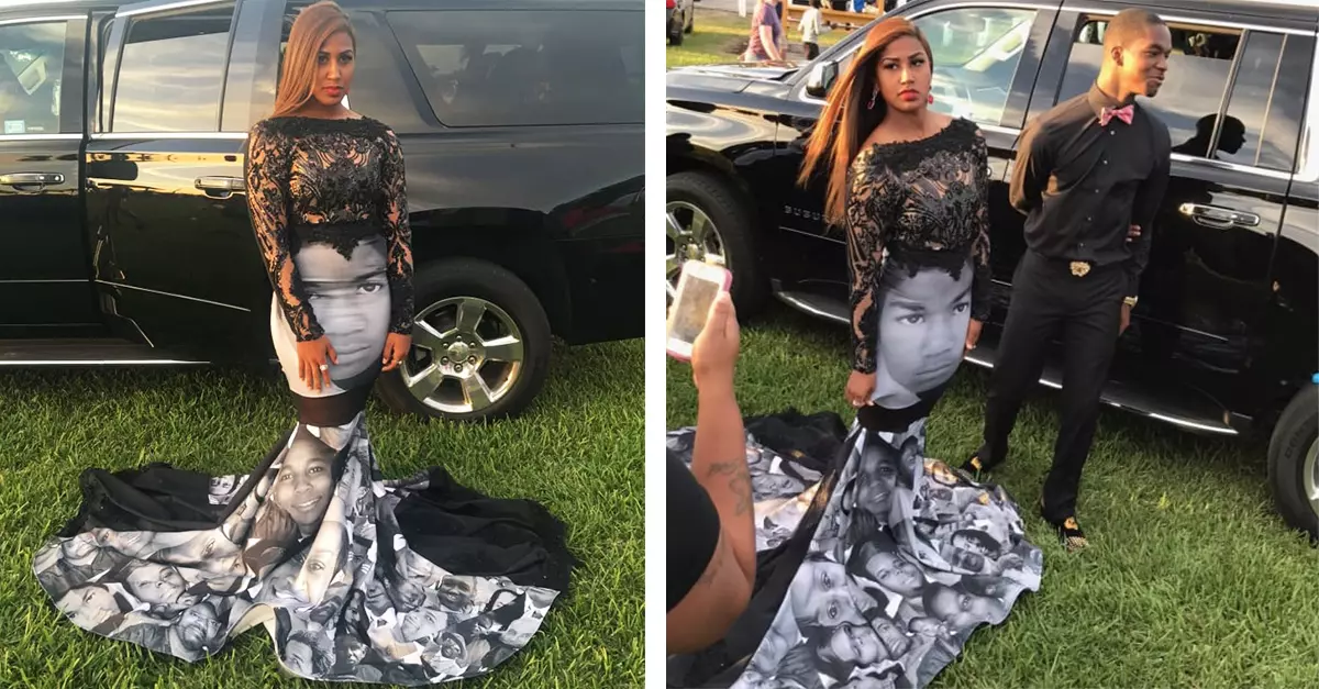 Un vestido largo con encaje es algo común en las graduaciones, pero Terrence decidió plasmar en el suyo las fotos de Trayvon Martin, Sandra Bland, Michael Brown y otros hombres y mujeres de color que han perdido la vida a causa de la brutalidad policíaca, inspirado en el movimiento pro derechos humanos y por la dignidad de las personas de color en Estados Unidos, Black Lives Matter.