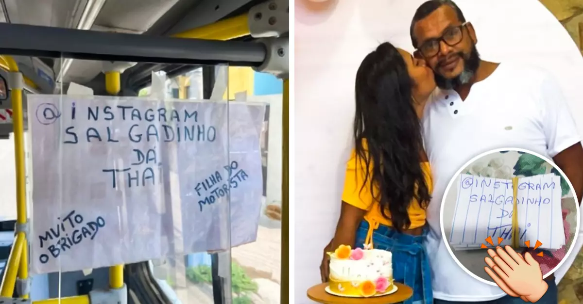 Elaboró un cartel a mano que colocó detrás de su asiento. En este se podía leer una cordial invitación a seguir las redes oficiales de Thai Salgadinhos, el negocio de su hija. Además, realizó pequeñas tarjetas a mano, que entregó a las personas que abordaron el autobús.