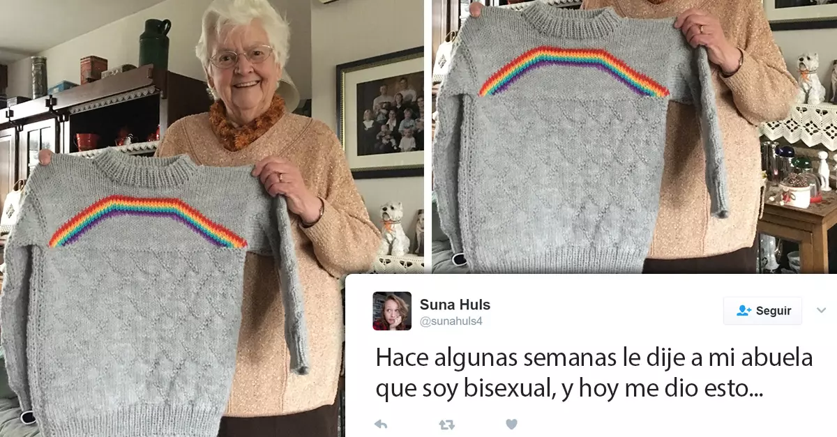 “Hace algunas semanas le dije a mi abuela que soy bisexual, y hoy me dio esto. Mi abuela me dio un suéter de arcoíris”.