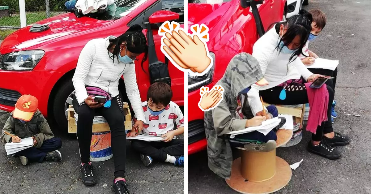 La imagen de una joven madre franelera junto a sus dos hijos tomando clases en la calle se ha hecho viral en redes sociales.