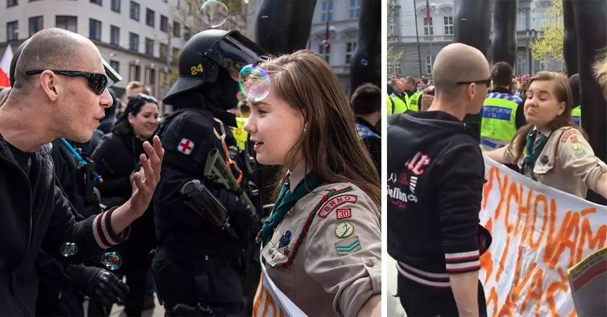 En el momento en que ambos grupos coincidieron, surgió una de las imágenes más emblemáticas y que se ha convertido en un icono contra este tipo de muestras de odio a nivel internacional: una joven scout llamada Lucie Myslíková, de 16 años, haciendo frente a un neo-nazi visiblemente enfadado.