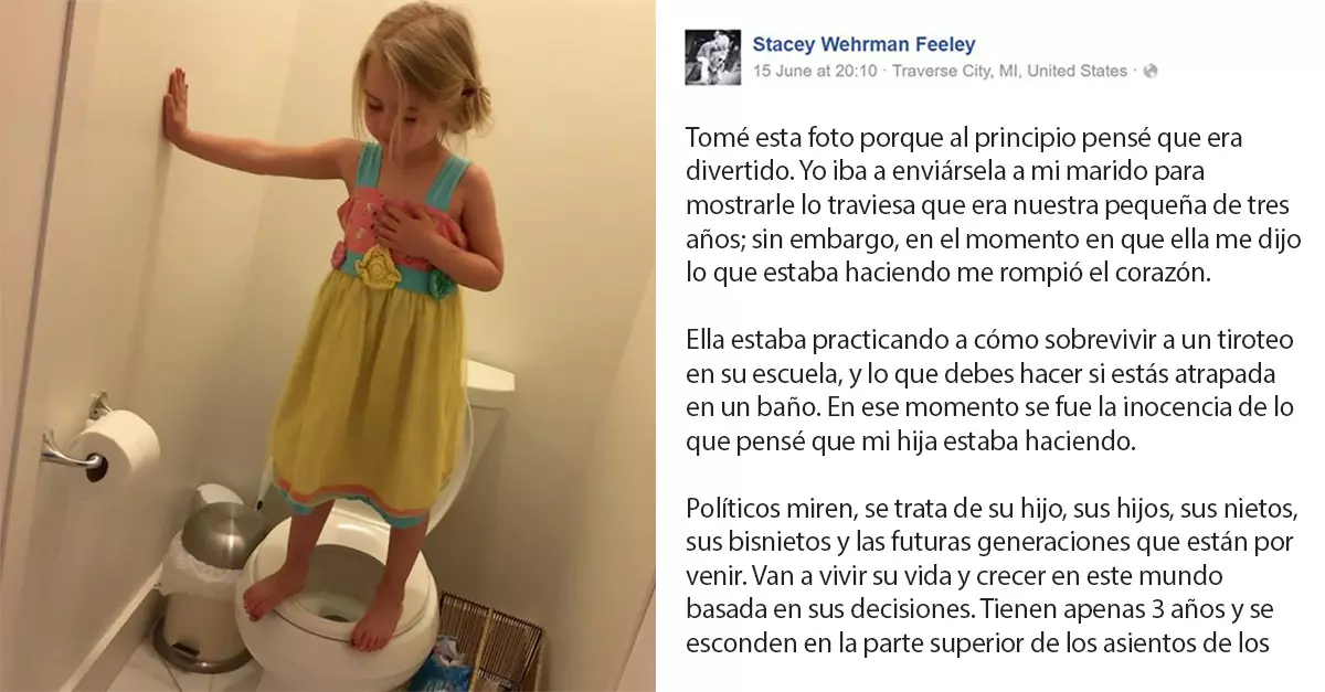 Ella estaba practicando a cómo sobrevivir a un tiroteo en su escuela, y lo que debes hacer si estás atrapada en un baño. En ese momento se fue la inocencia de lo que pensé que mi hija estaba haciendo.