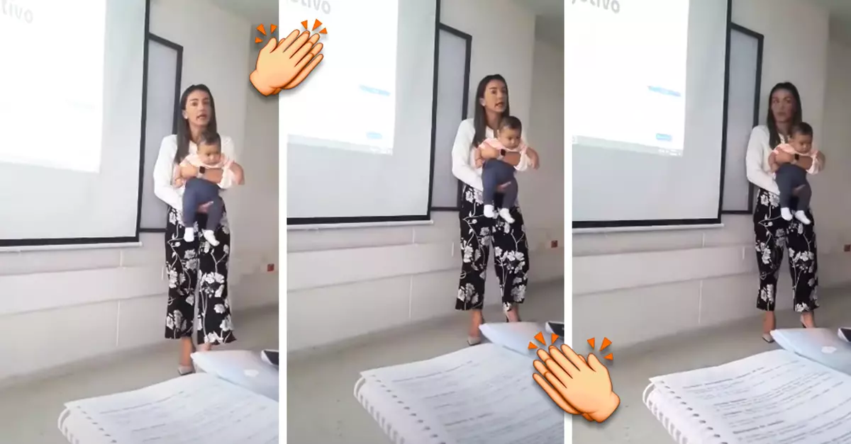 En la Universidad de Santo Tomás, en Colombia, en la Escuela de Derecho y Ciencias Políticas, la maestra Karol Viviana Vega fue captada cargando un bebé mientras impartía clases.