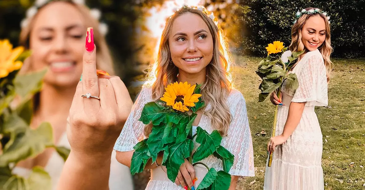 En la ceremonia de “compromiso propio” celebrada el año pasado, Patricia compró un anillo de bodas, flores y un vestido increíble al estilo bohemio. En total, gastó aproximadamente 70 dólares. La ceremonia solo duró 30 minutos y estuvo rodeada de sus seres queridos.