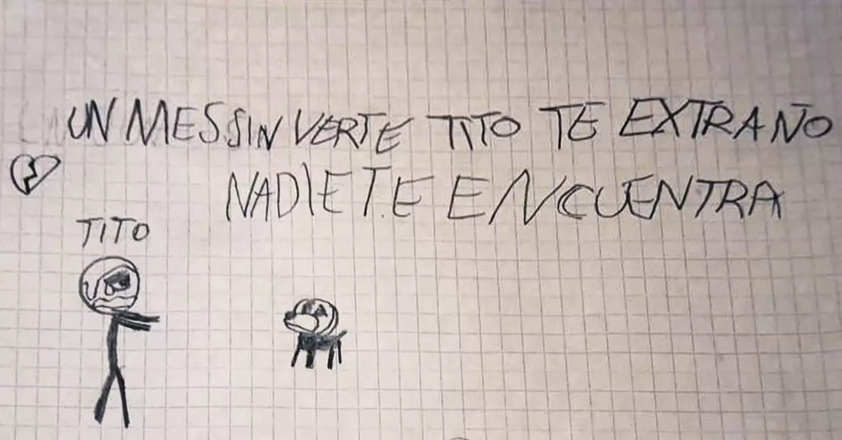 Leo es un niño argentino que vive en Río Gallegos, capital de la provincia de Santa Cruz, y ahora es conocido porque un día, en una hoja de cuaderno, se dibujó a sí mismo y a Tito, su amigo de raza caniche, con notorias expresiones de tristeza y un mensaje que reza: “Un mes sin verte Tito te extraño. Nadie te encuentra. Todos me preguntan si te encontré y les digo que no”.