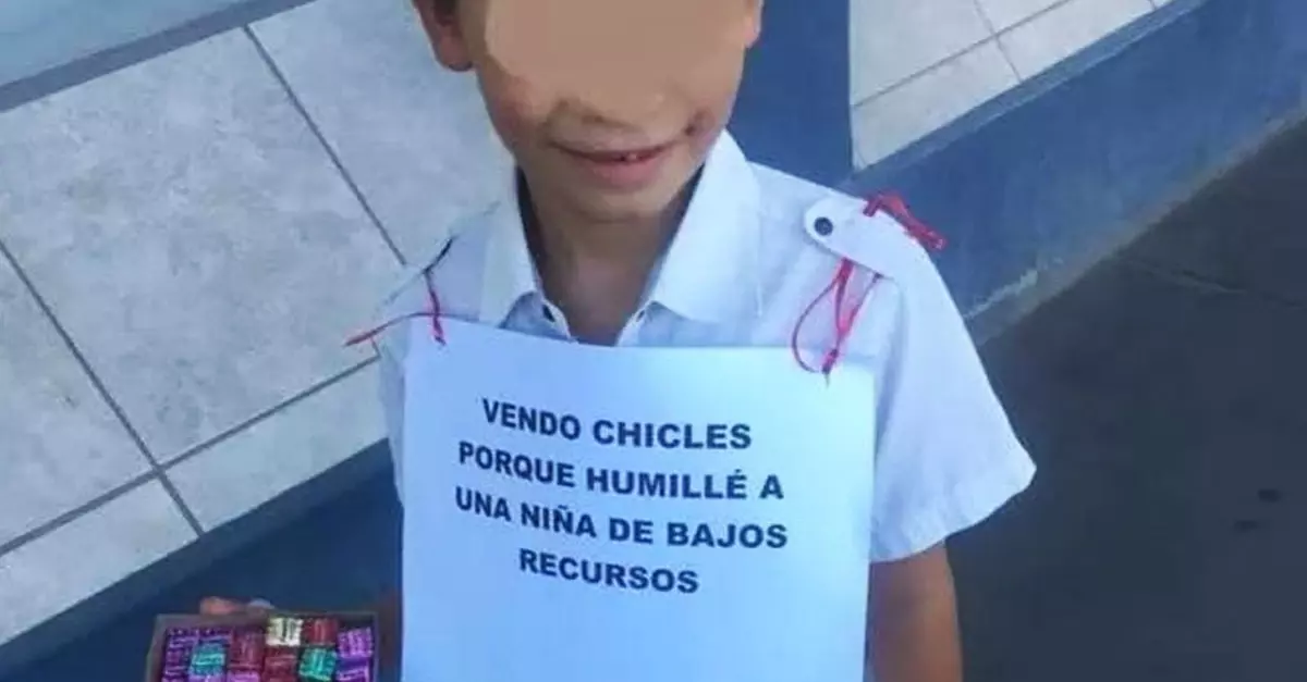La tía del pequeño imprimió un cartel en el que se podía leer “Vendo chicles porque humillé a una niña de bajos recursos”; la idea era que el pequeño fuera por la calle vendiendo los dulces a las personas que pasaran y además les explicara que se había burlado de una pequeña de su edad, quien desafortunadamente no tiene los mismos privilegios que él.