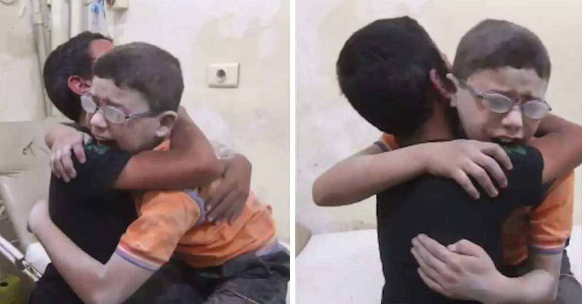 El video muestra las imágenes de dos pequeños cubiertos en polvo y que se aferran el uno al otro por la pérdida de sus hermanos por un barril bomba.