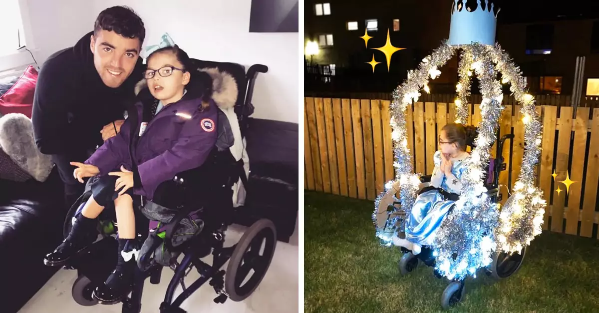 Josh se dio a la tarea de customizar la silla de ruedas de Ava, creando un hermoso carruaje personal muy al estilo Cenicienta. Para lograrlo, empleó tubos de cañería, oropel y luces.