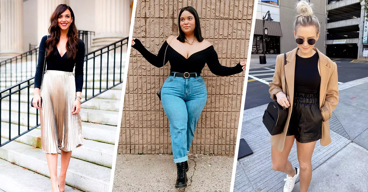 El clásico bodysuit negro nunca nos falla y basta con uno con una silueta bonita y un escote coqueto para que tus jeans y combat boots se vean increíbles. Combínalo con un cinturón que resalte tu cintura y accesorios a juego y serás la más bella del condado.