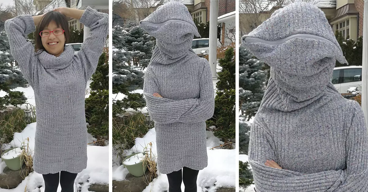 De acuerdo con Ruth, el suéter es una prenda muy funcional, con el único defecto de que no puedes ver nada a través de él. Aun así es perfecto para cuando necesites estar sola y alejada de todos. Además, puedes usarlo de tres diferentes maneras: en cuello alto, hasta los hombros o en el modo “déjame en paz”. Aquí te mostramos las instrucciones para que puedas hacer el tuyo.