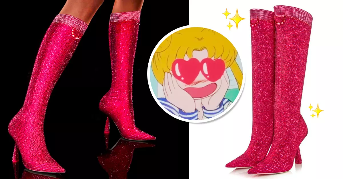 El diseño rinde homenaje a Sailor Moon con la fantasía y el glamur característicos de Jimmy Choo, haciendo eco del look de transformación de Usagi Tsukino o Sailor Moon. Fruto de una exquisita artesanía, las botas hasta la rodilla están adornadas con 19 mil incrustaciones de cristales de Swarovski en un intenso color fucsia.