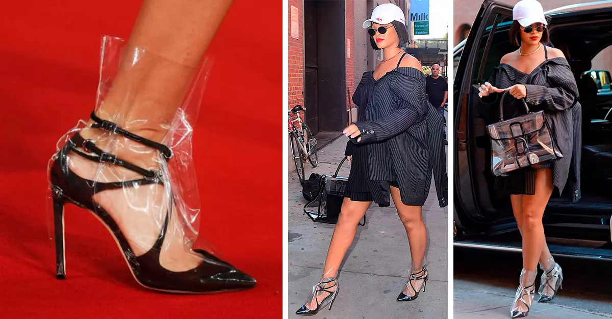 Hace poco nos sorprendió cuando apareció luciendo una gorra de béisbol, gafas de sol y un vestido -experimento con dos sacos-; pero lo que más nos llamó la atención fueron sus zapatillas de Cenicienta, y no porque estuvieran hechas de cristal, sino porque se trataba de unos simples tacones cubiertos con una bolsa de plástico. Aunque solo Riri se atreve a llevarlos con estilo.