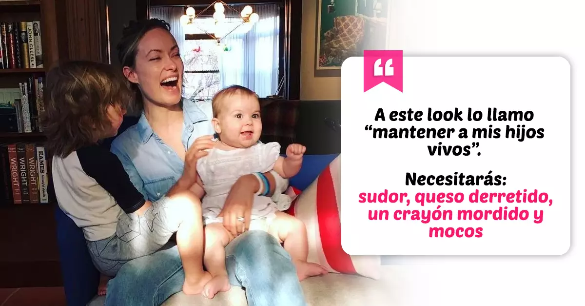 A este look lo llamo “mantener a mis hijos vivos”. Necesitarás: sudor, queso derretido, crema para rozaduras, un crayón mordido, mocos y una pizca entusiasta de pánico.