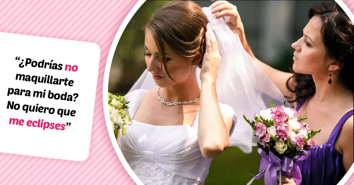 Una novia pidió a su dama de honor que no se maquillara ni peinara para su boda, pues sentía que si lo hacía la opacaría. Todo comenzó cuando la mujer le envió un mensaje a su amiga diciéndole que quería pedirle un favor: que no usara ni una gota de maquillaje; la dama le comentó que sabía que no debía abusar de los cosméticos, pero la plática no quedó ahí: la novia le pidió que tampoco se peinara, pues no quería que se viera mejor que ella.